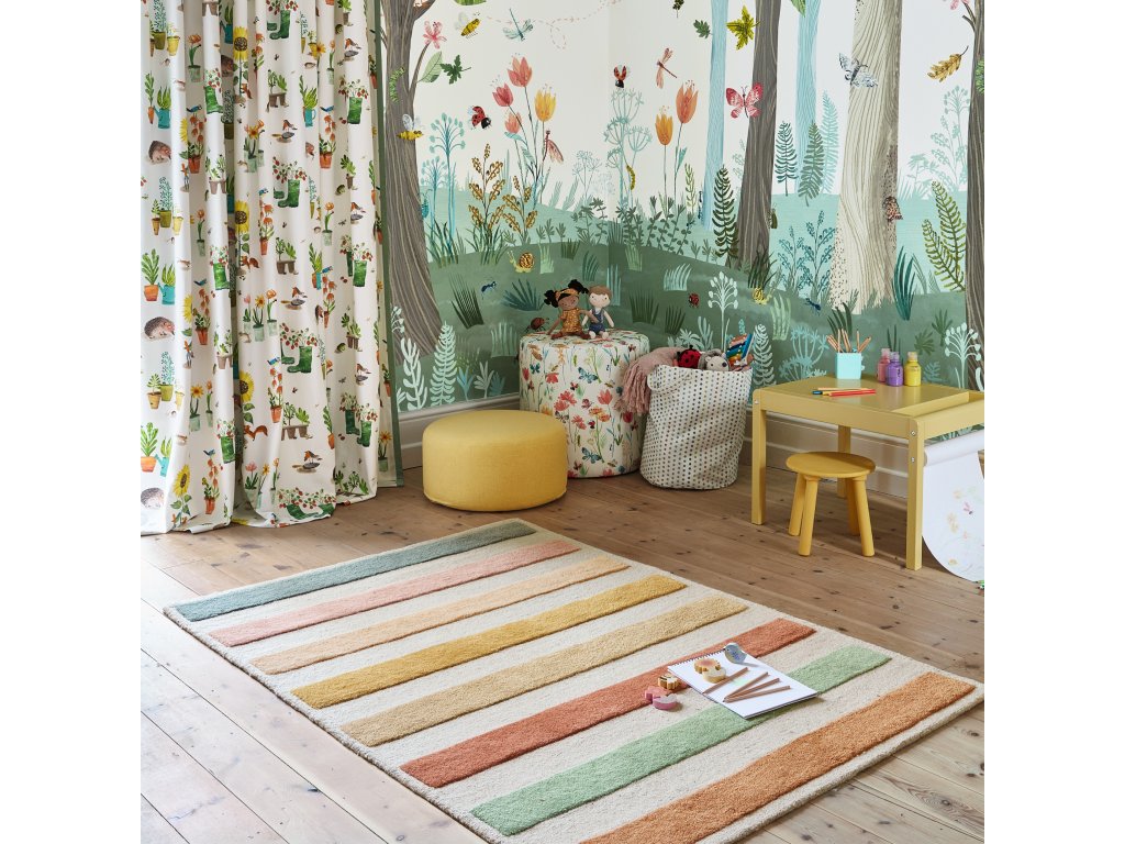 Klasické pruhy z cukrové třtiny ožívají na tomto hmatovém vlněném koberci, který se vyznačuje kombinací hmatové smyčky a řezaných vlasů, které vytvářejí trojrozměrný efekt.