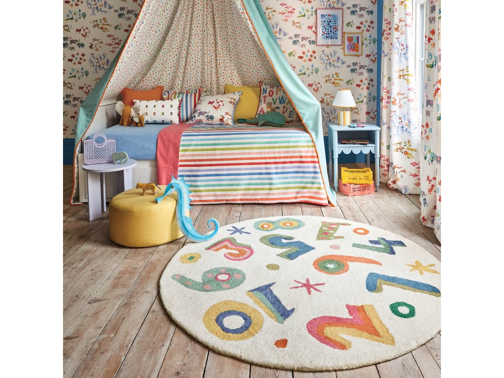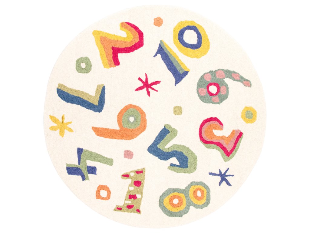 Barevná čísla od 1 do 10 v charakteristickém stylu ilustrátora Christophera Corra vytváří nezapomenutelný ručně všívaný vlněný koberec, který je vzdělávací i hravý.